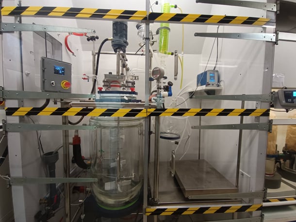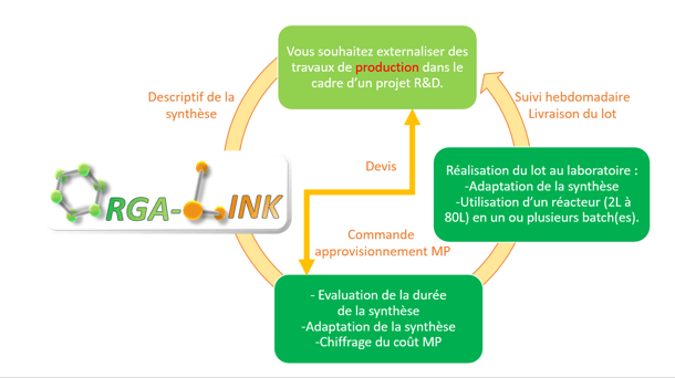 ORGA-LINK vous propose de réaliser vos synthèses à l'échelle d'une première production. Doté de réacteurs jusqu'à 80L, nous réalisons des synthèses à l'échelle de la dizaine de kilos (ou plus en plusieurs batches).